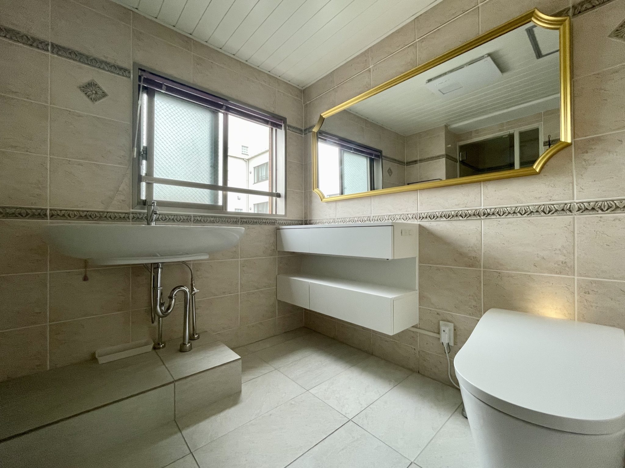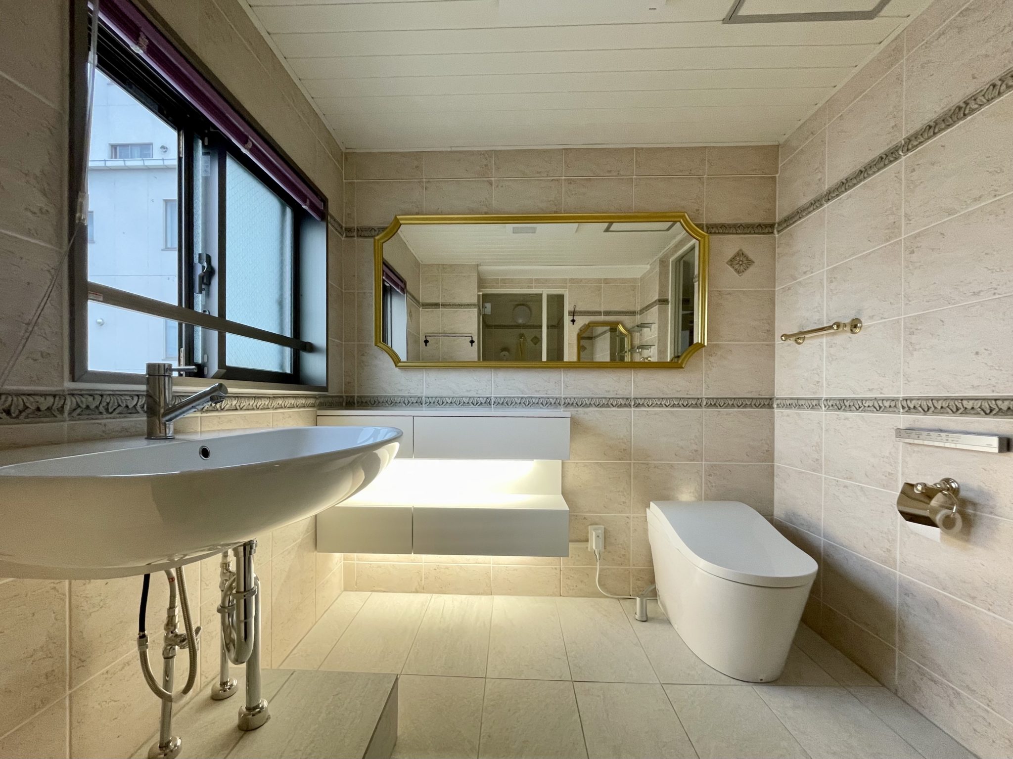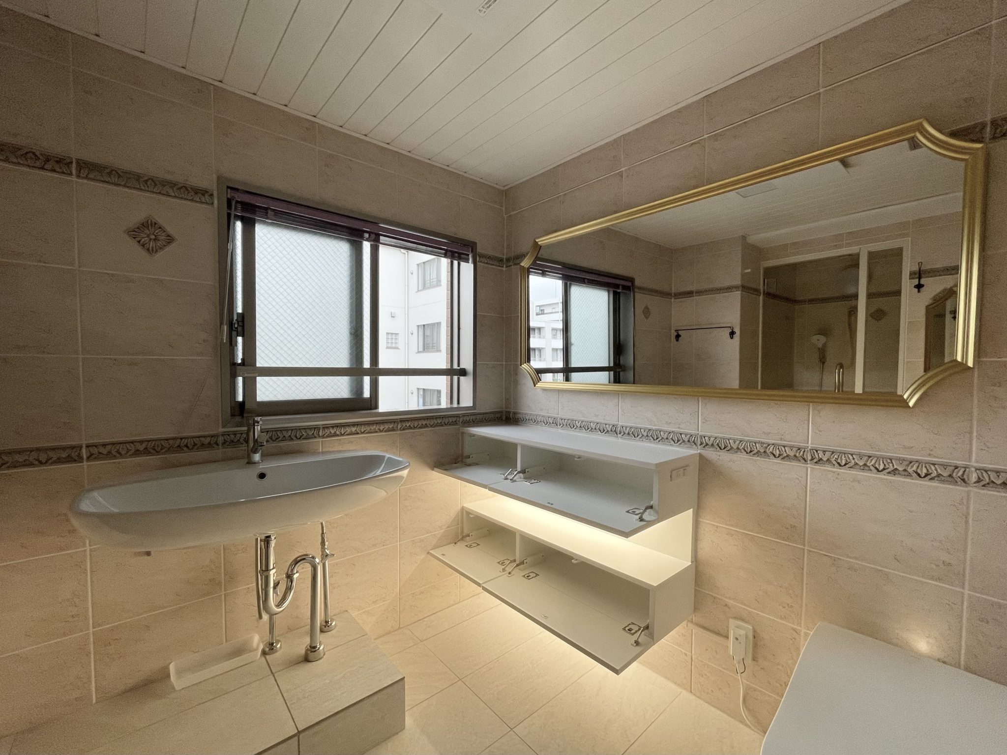 使い勝手がよくなった洗髪洗面器、壁付人工大理石カウンターにはタオルやアメ二ティを収納、均質だった明かりが間接照明効果で雰囲気良く、大判ミラーの鏡効果で部屋が広く見えるようになりました。