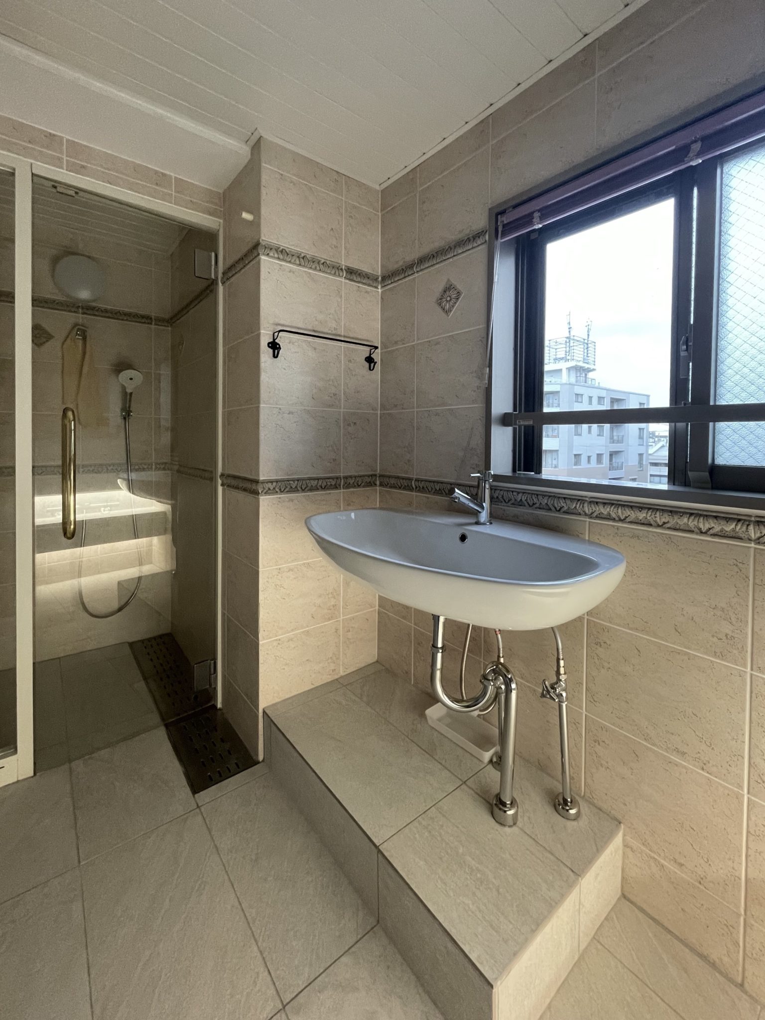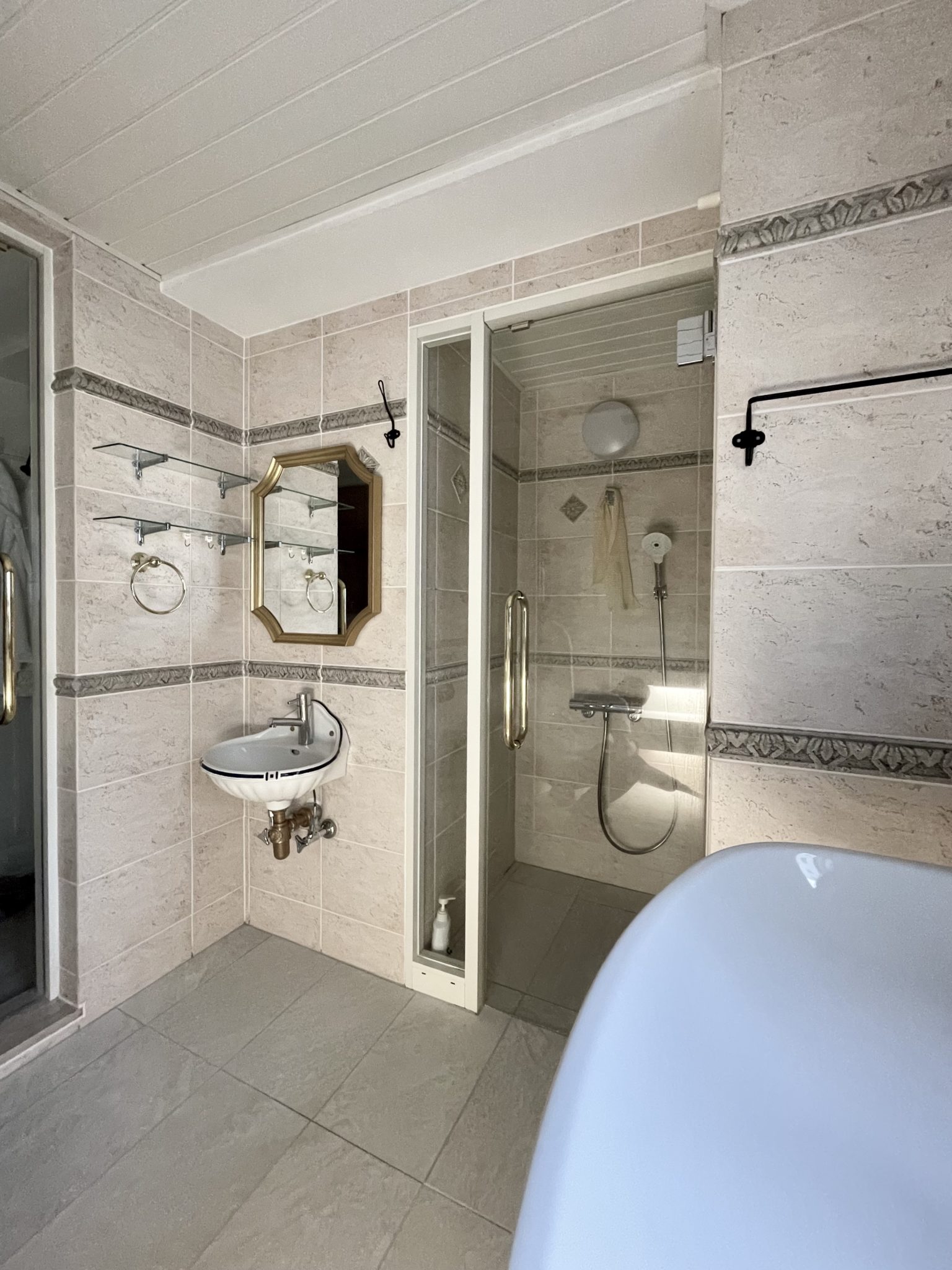 実際に現地へ伺うと、猫足バスタブ・専用のスタンド型シャワー・トイレ・洗面器・独立したシャワーブースがあり、床も壁もタイル貼の広くて素敵なバスルームでした。
